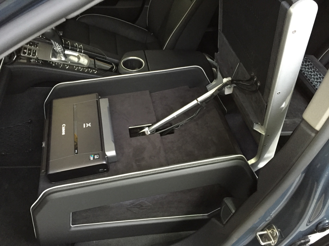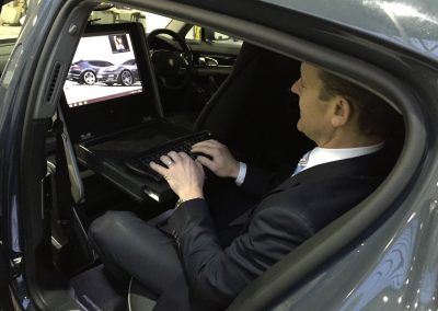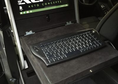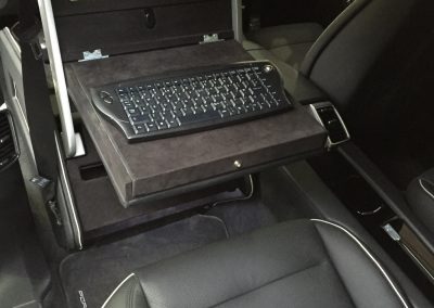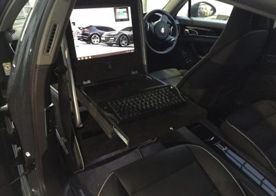 The makers of National Geographic Channel’s Supercar Megabuild approached us to create a mobile office inside a Porsche Panamera. We designed and built a pod, which sat in place of the passenger seat to create a workspace for a passenger in the rear. The pod was trimmed in leather to match the existing interior and was equipped with full mobile office facilities including a Windows PC with 15″ monitor, 4G Wifi, wireless keyboard with