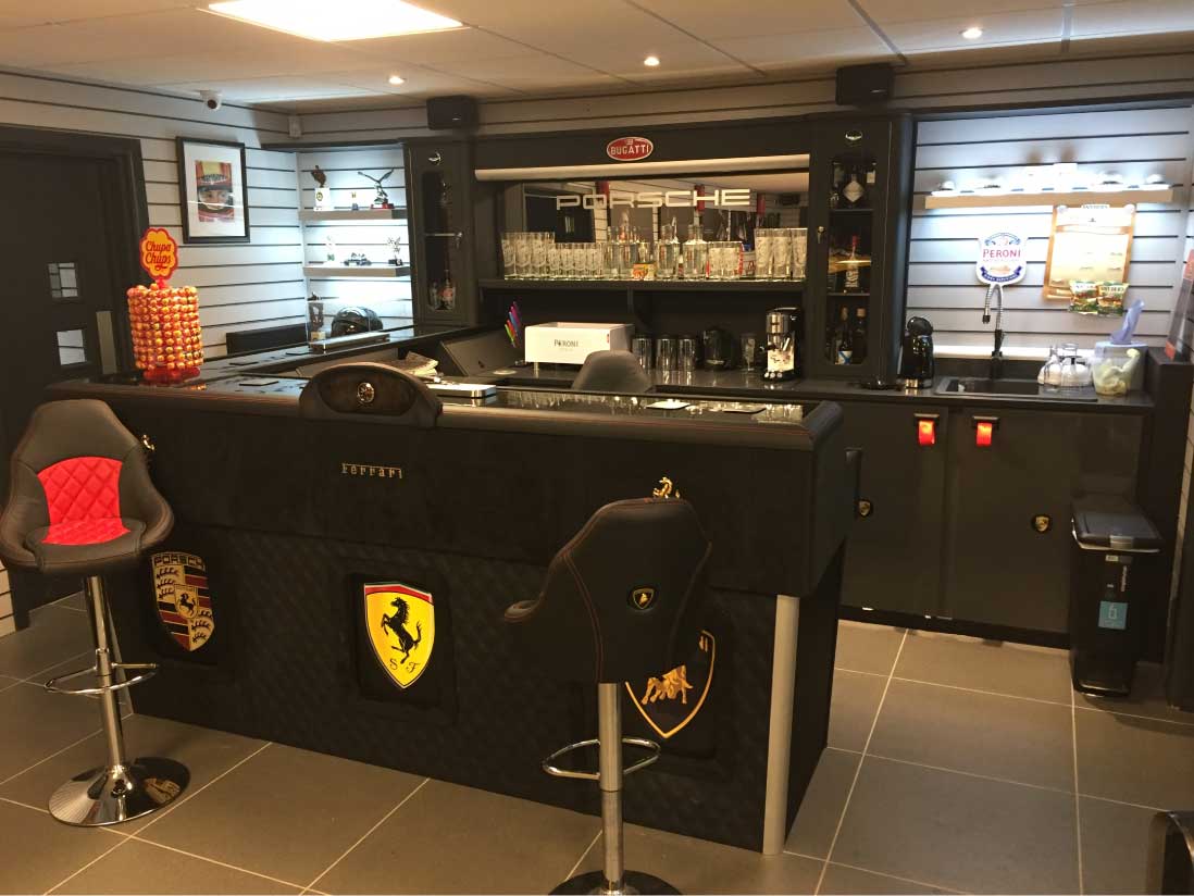 We don’t just specialise in vehicles, we often get approached to assist in all manner of custom projects, from leather cladding safes and door handles to redesigning a VIP ferris wheel pod, upholstering branded Golf Buggy Captains chairs for the Solheim Cup and even building a car themed bar in a customer’s home. Whatever your brief, if you can think it up we can make it happen.